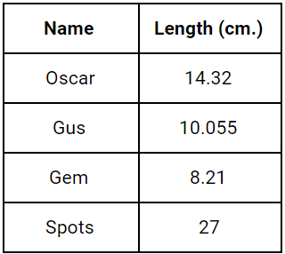 Suzeth compares the lengths of her pet fish. The table shows the lengths of the fish. What is the difference between the length of Oscar and Gem?