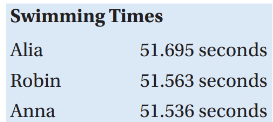 The table shows the times recorded by the top 3 swimmers in the 100 meter race. What is the value of the digit 6 in the fastest recorded time? Remember, the fastest is the shortest amount of time.