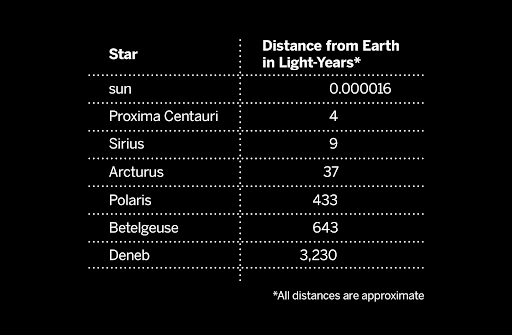 Using the chart above, how do you know the Deneb is the farthest star from Earth?