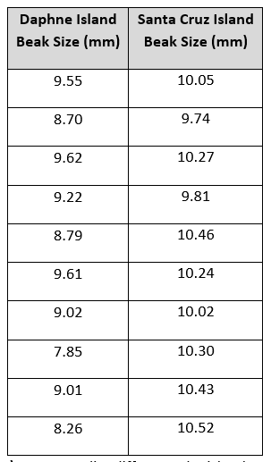 The table below shows measurements of the beak size of a sample of ten ground finches on each of two islands in the Galápagos archipelago. The two islands are about ten kilometers apart, and all the birds are the same species. Given that beak size is genetically determined, which of the following hypotheses is the most likely explanation for the differences in data between the islands?