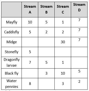 A researcher collects samples of aquatic insects from a variety of streams, as shown in the table.