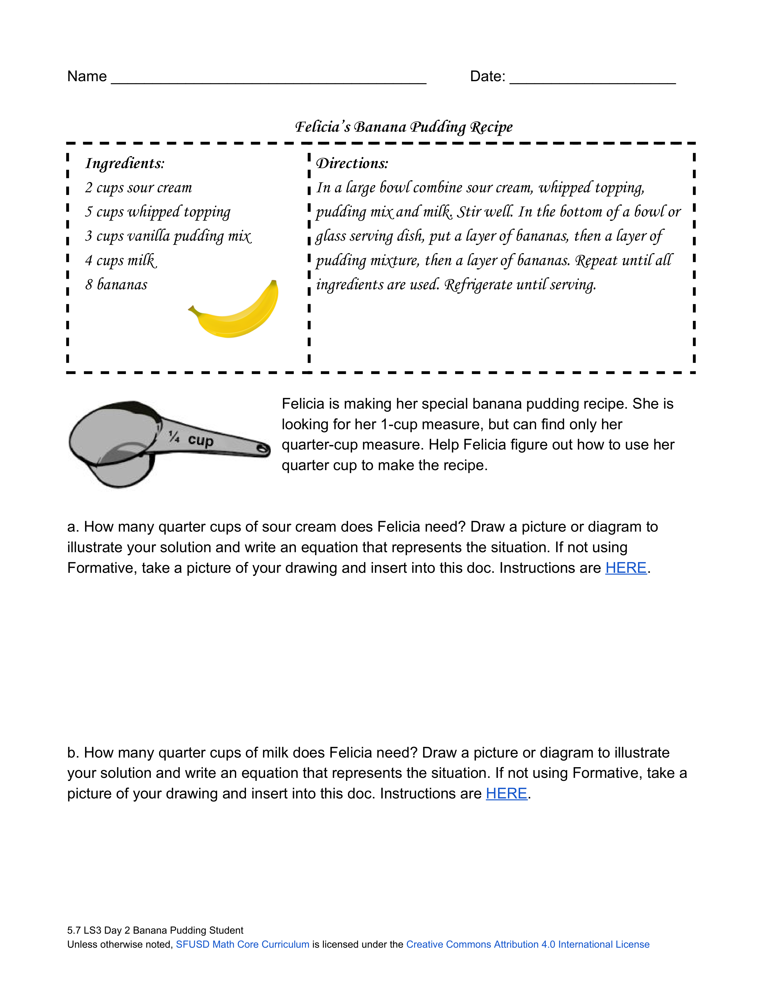 Felicia does not remember in what order she added the ingredients but the last ingredient added required 12 quarter cups. What was the last ingredient Felicia added to the pudding? Draw a picture or diagram to illustrate your solution and write an equation that represents the situation.