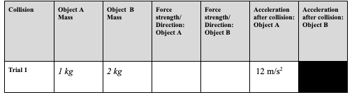 For Each Trial, drag a second object of a different mass into the screen and place it on the same plane as object A, 8 grid unit apart.