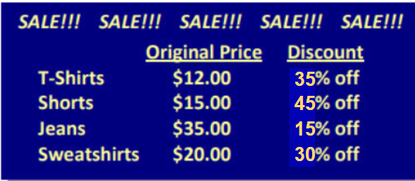 You want to buy a new pair of shorts and Kohl's is having a sale. Using the chart below, determine how much you will spend at Kohl's if there is not sales tax.