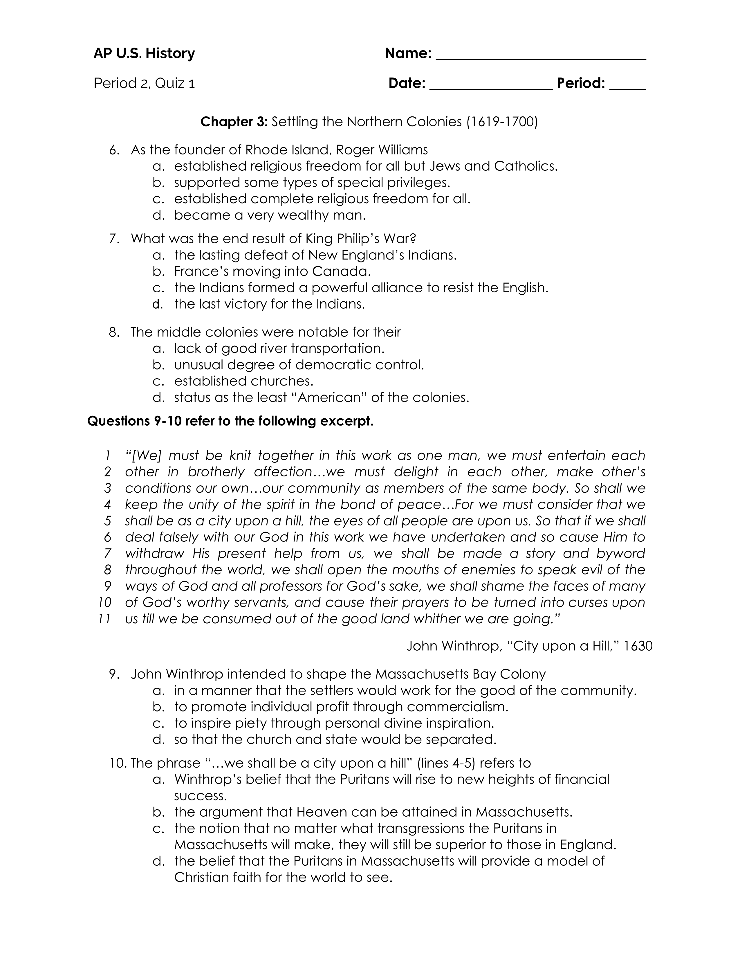 APUSH Period 2.1 Quiz (Ch. 2-3) - SY2021