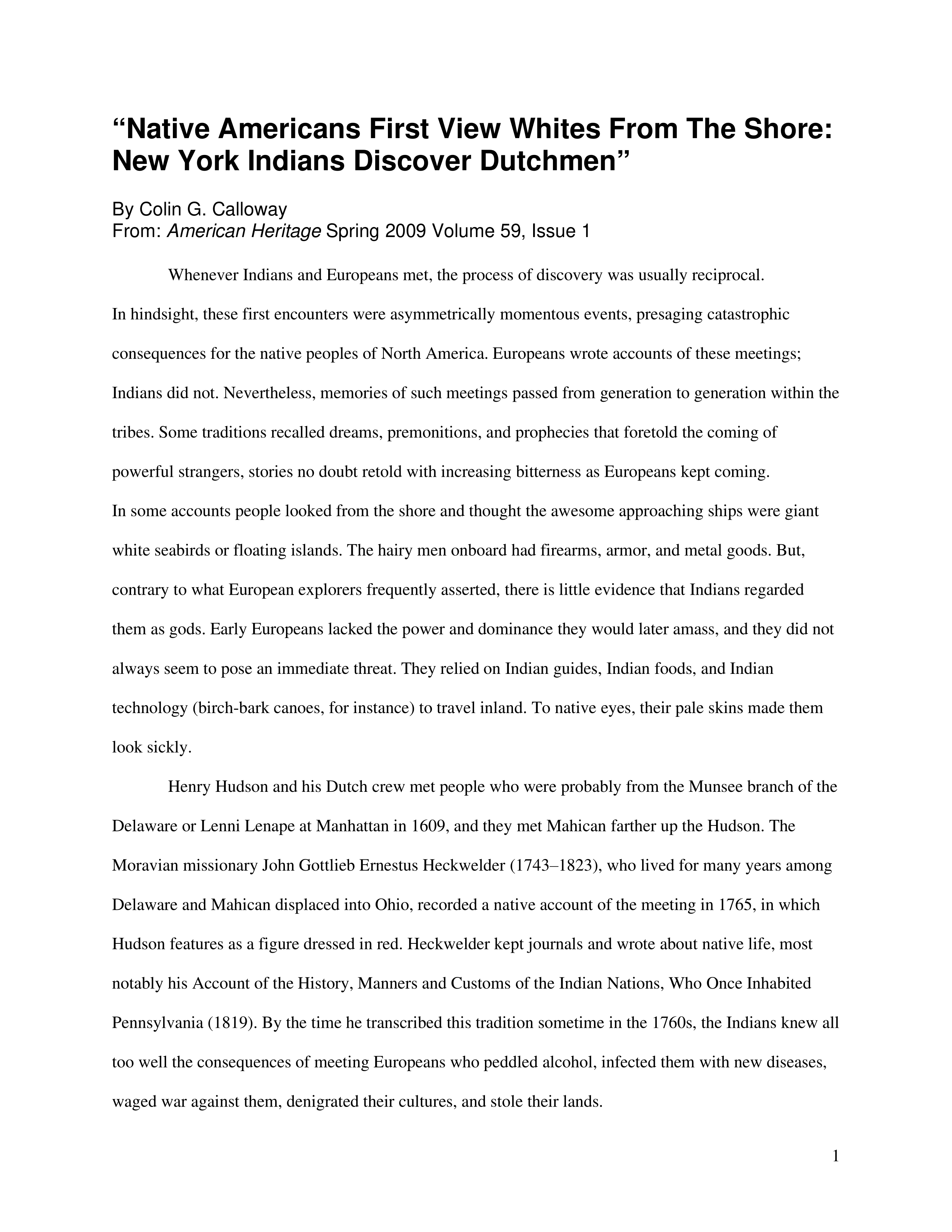 "Native Americans First View Whites From the Shore: New York Indians Discover Dutchmen"