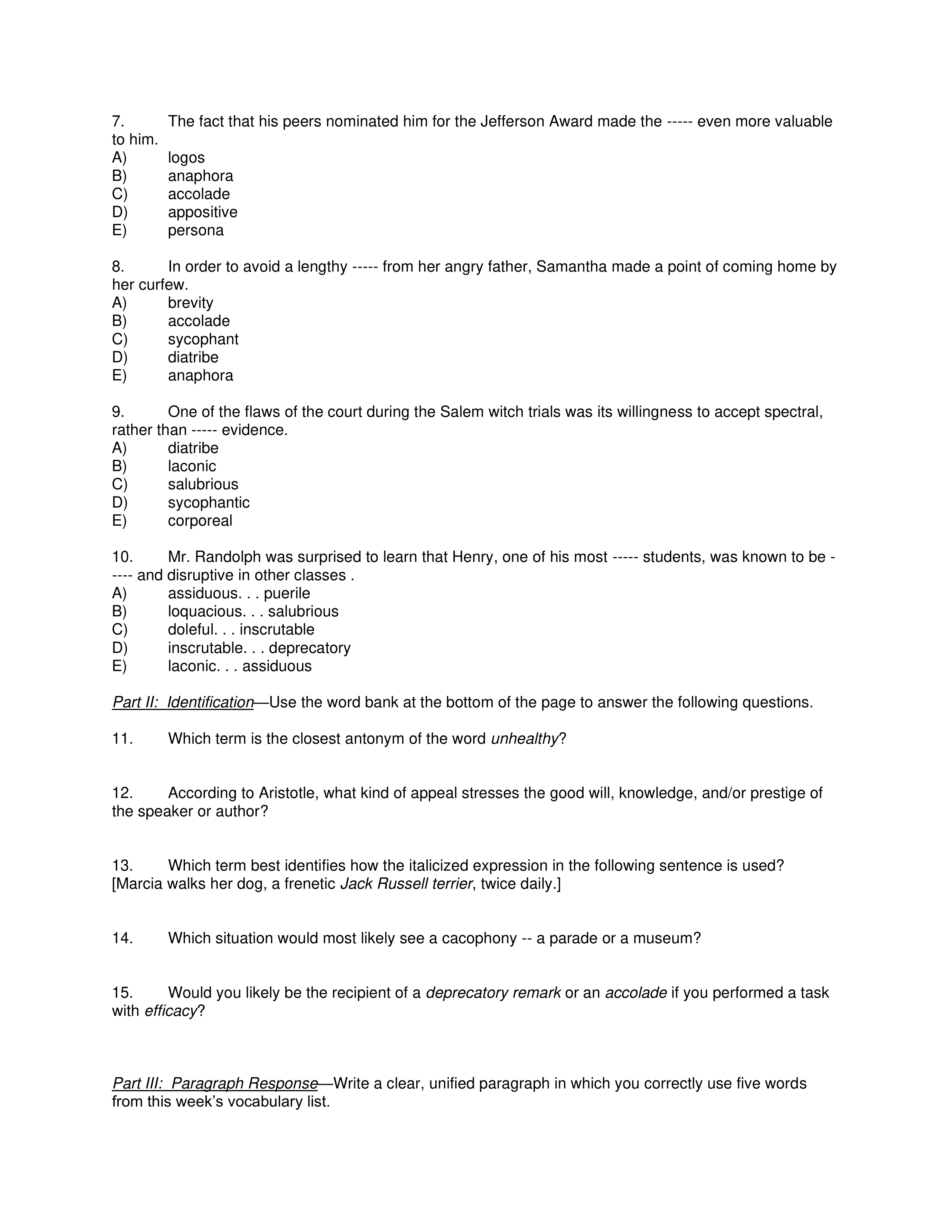 You must use the following 5 words in your essay -- abstract, laconic, loquacious, puerile, and sycophant. You may use others as necessary.