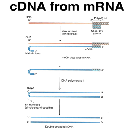When inserting or using genes, scientists often prefer to use complimentary DNA (cDNA). cDNA is DNA that is made from a mRNA transcript. The mRNA that is used is mature and has had its introns removed. The following diagram shows how cDNA is made using mRNA as a template.