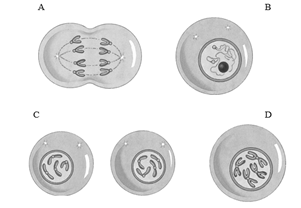 Starting with the cell closest to the beginning of mitosis, arrange the letters P, Q, R and S in the order in which they would occur during the cell cycle.
