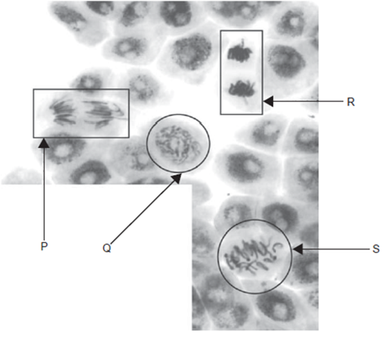 The letters P, Q, R and S indicate cells that are at different points in the cell cycle.