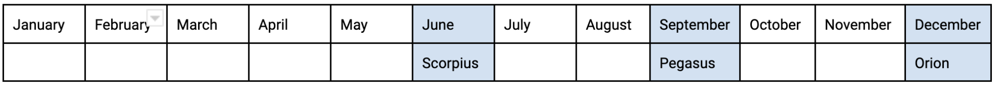 The chart below summarizes what weβve learned so far about the constellations shown on the artifact and the month they are the MOST visible in the night sky: