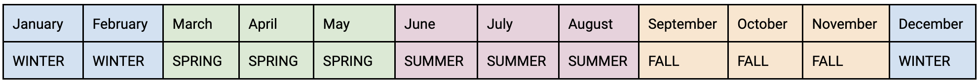 This calendar shows the months of the year that are commonly associated with the seasons in North America. For example, we think of July as a summer month!