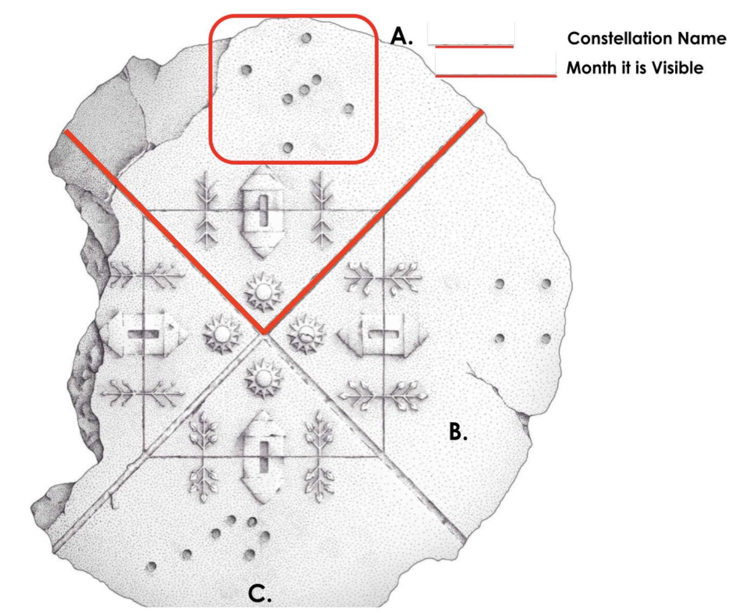 We also notice that there is a pattern with the trees on the artifact, which shows us the season and months of the year when each constellation is visible in the sky. We can use this pattern to figure out the constellations!