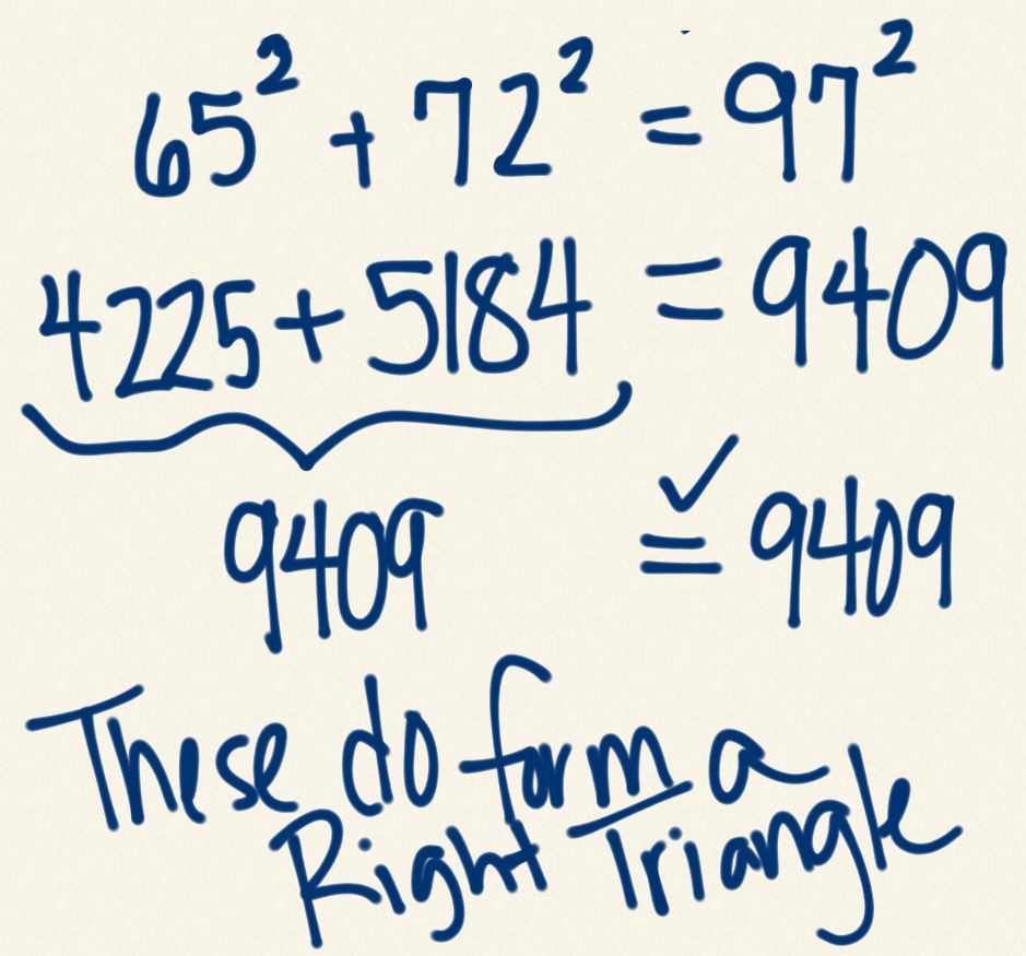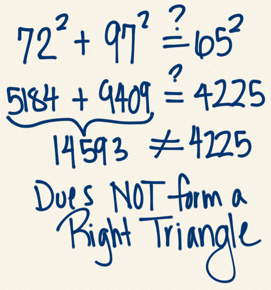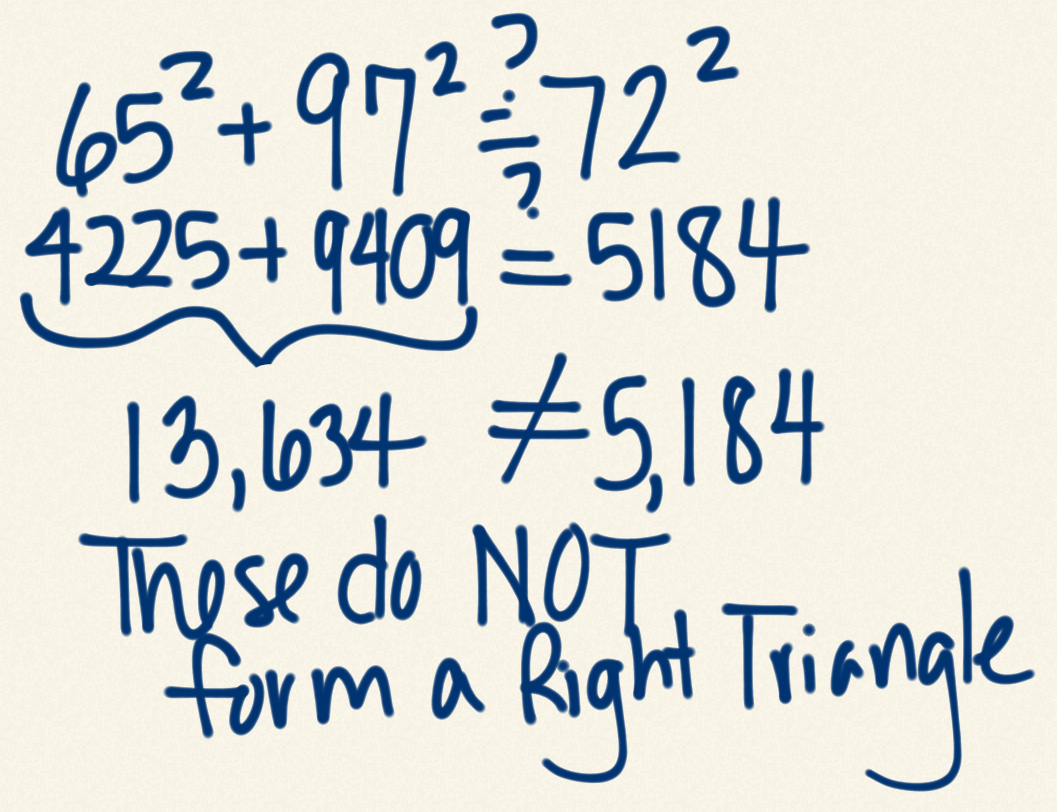 Which is the correct work to determine if a triangle with side lengths of 72, 97, and 65 form a right triangle?