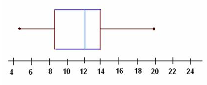 The five-number summary for the data is Min: 5, Q1: 8.5, Median: 12, Q3: 14, and Max: 20.