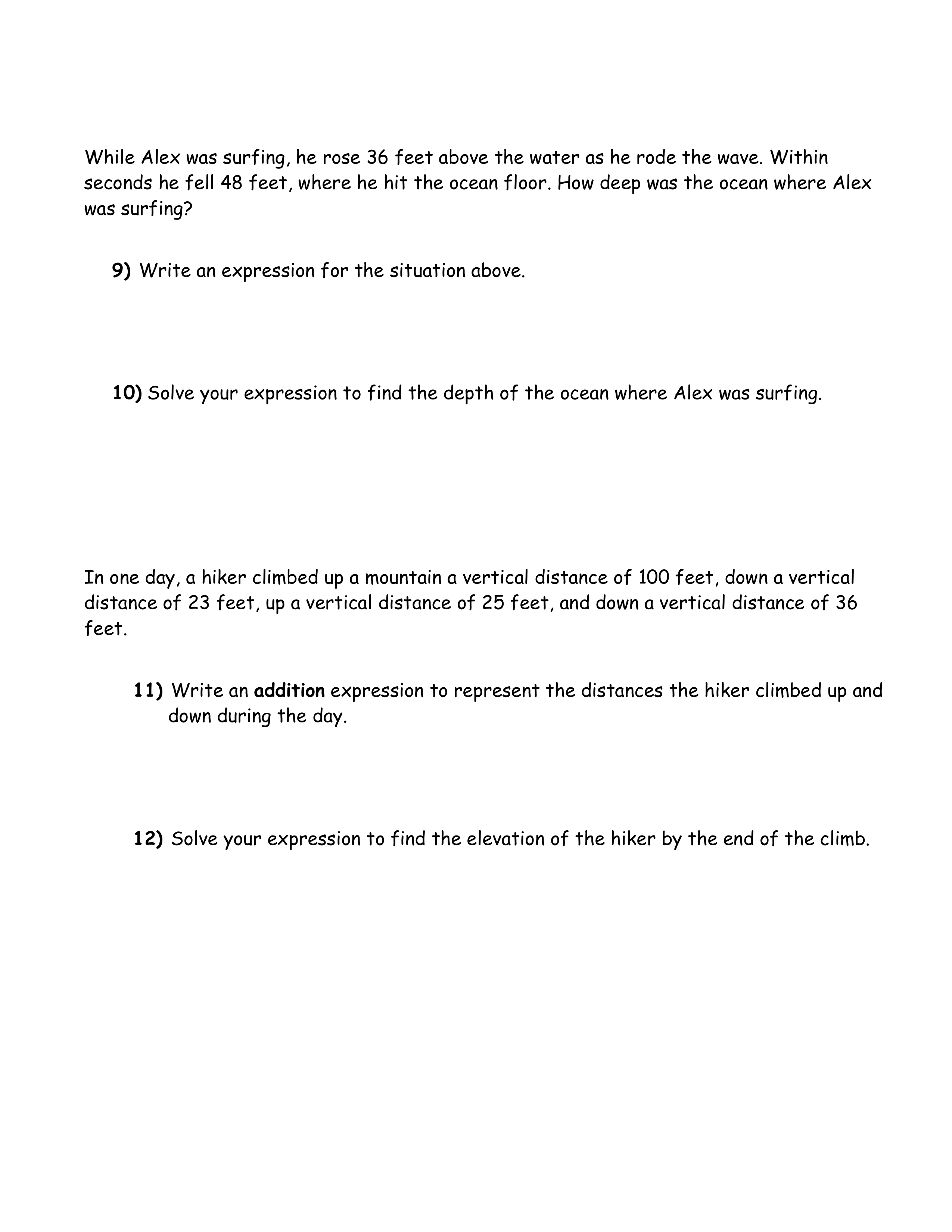 In one day, a hiker climbed up a mountain a vertical distance of 100 feet, down a vertical distance of 23 feet, up a vertical distance of 25 feet, and down a vertical distance of 36 feet. Write an addition expression to represent the distances the hiker climbed up and down during the day.