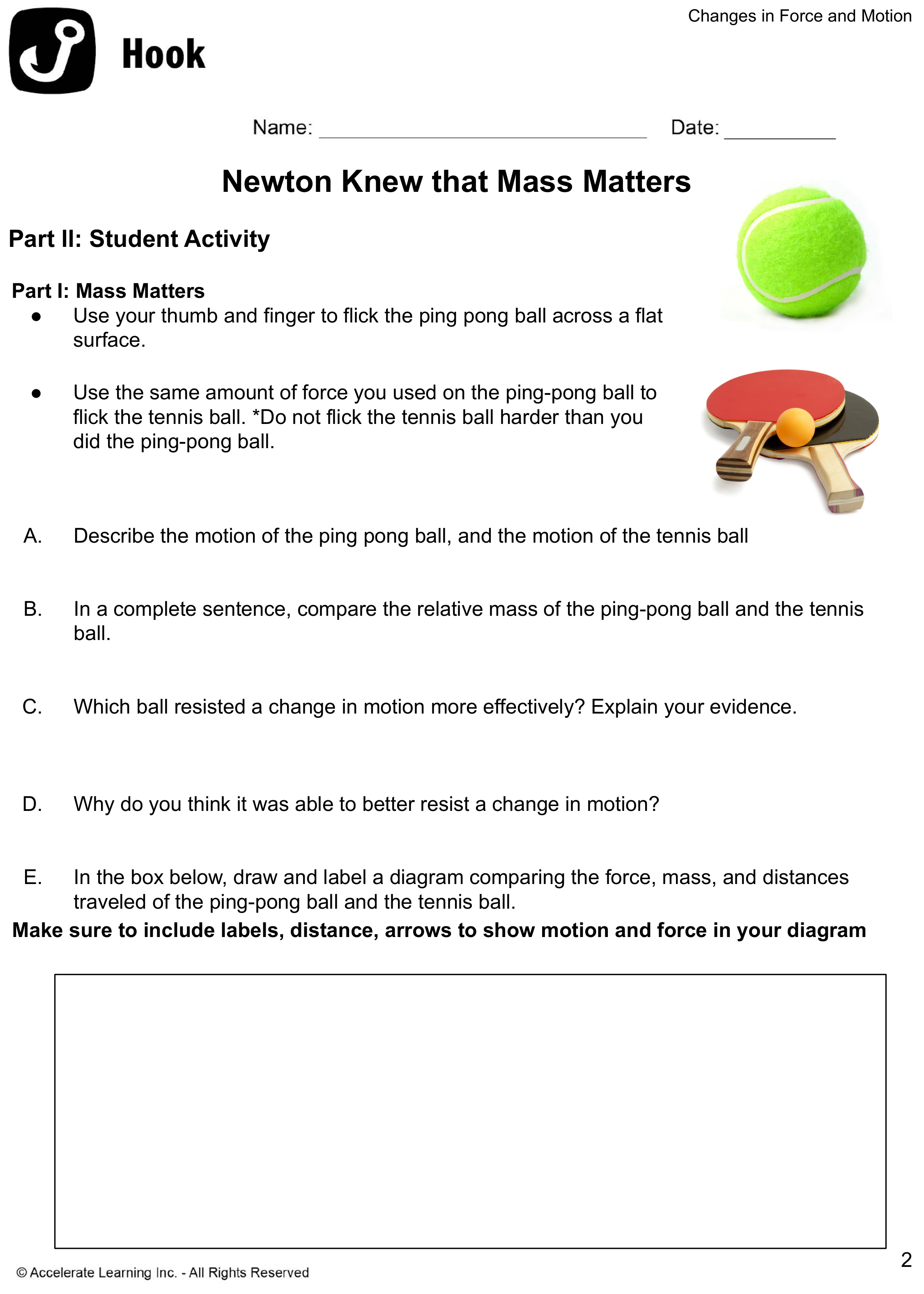 In the box below, draw and label a diagram comparing the force, mass and distances traveled of the ping-pong ball and the tennis ball.