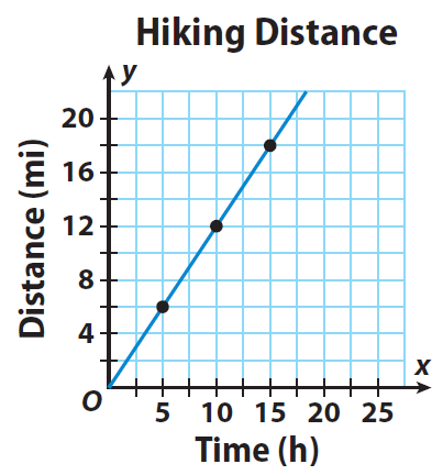 The graph shows the relationship between time and distance hiked. Write an equation for the proportional relationship.