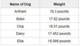 Recorded in the table below are weights of some dogs. Which dogs, when weighed to the nearest whole pound, weigh 18 pounds? Select all that apply