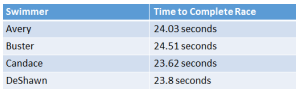 The results of a swimming race are shown in the table below. Who won the race by completing the race in the shortest amount of time?