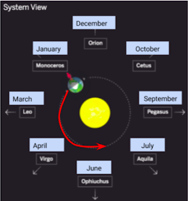 Reminder: This diagram shows us which months each of the constellations would be directly overhead the observer on Earth and visible at night.
