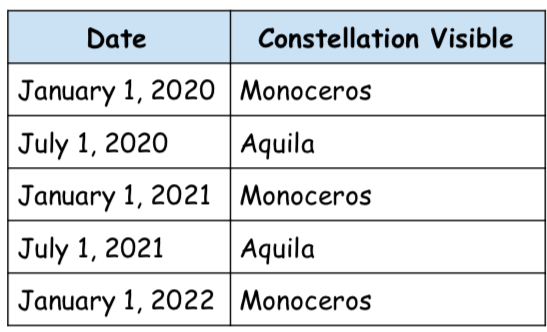 Using the patterns in the data table above, what constellation would be visible on January 1, 2038?