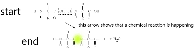 Next to the word "start" in the image above, you'll see two amino acids that are about to be bonded together. The molecules apper to be identical BUT which part of the amino acids should appear different if these are two amino acids are chemically different with properties (for example one could be polar and the other could be nonpolar)?