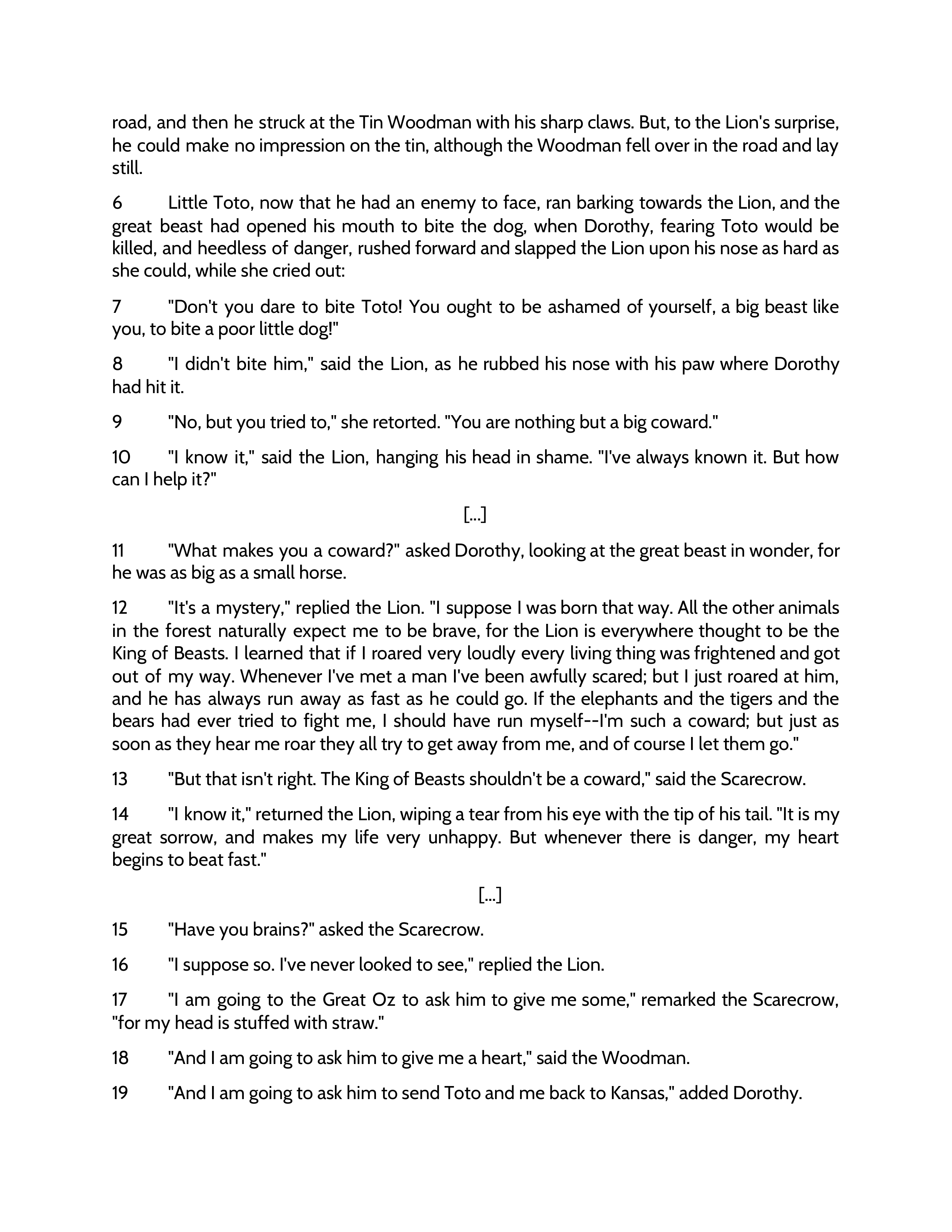C. “‘I suppose so. I've never looked to see,’ replied the Lion.” (paragraph 16)