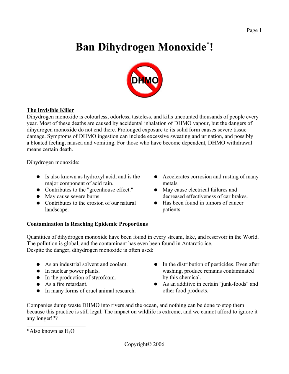 In the article, DHMO have been found in every stream, lake and reservoir in the World. What animals will feel the impact the most by DHMO?
