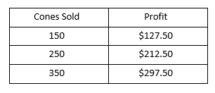 Use the variables from question 7 to write an equation to represent the profit for any number of cones sold.