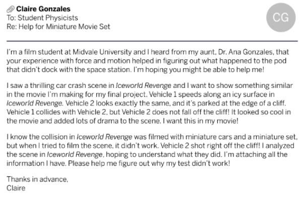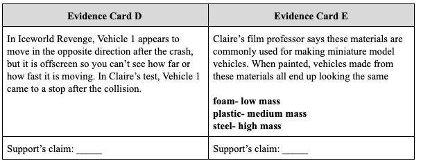 Claim 1: The vehicles in Iceworld Revenge had different masses; in Claire’s test, the vehicles had the same mass.