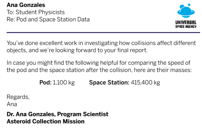 How can you use this information about mass to help you compare the speed of the pod after the collision to the speed of the space station after the collision?