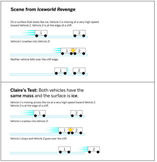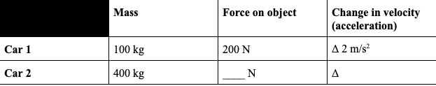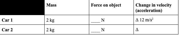 A proportional model has been created to analyze the relationship between force, mass and acceleration in both the movie and the recreation. Calculate acceleration of each object below.