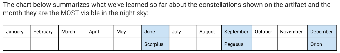Reading about the constellations we think are shown in the artifact, what months is Scorpius visible high in the night sky in North America?