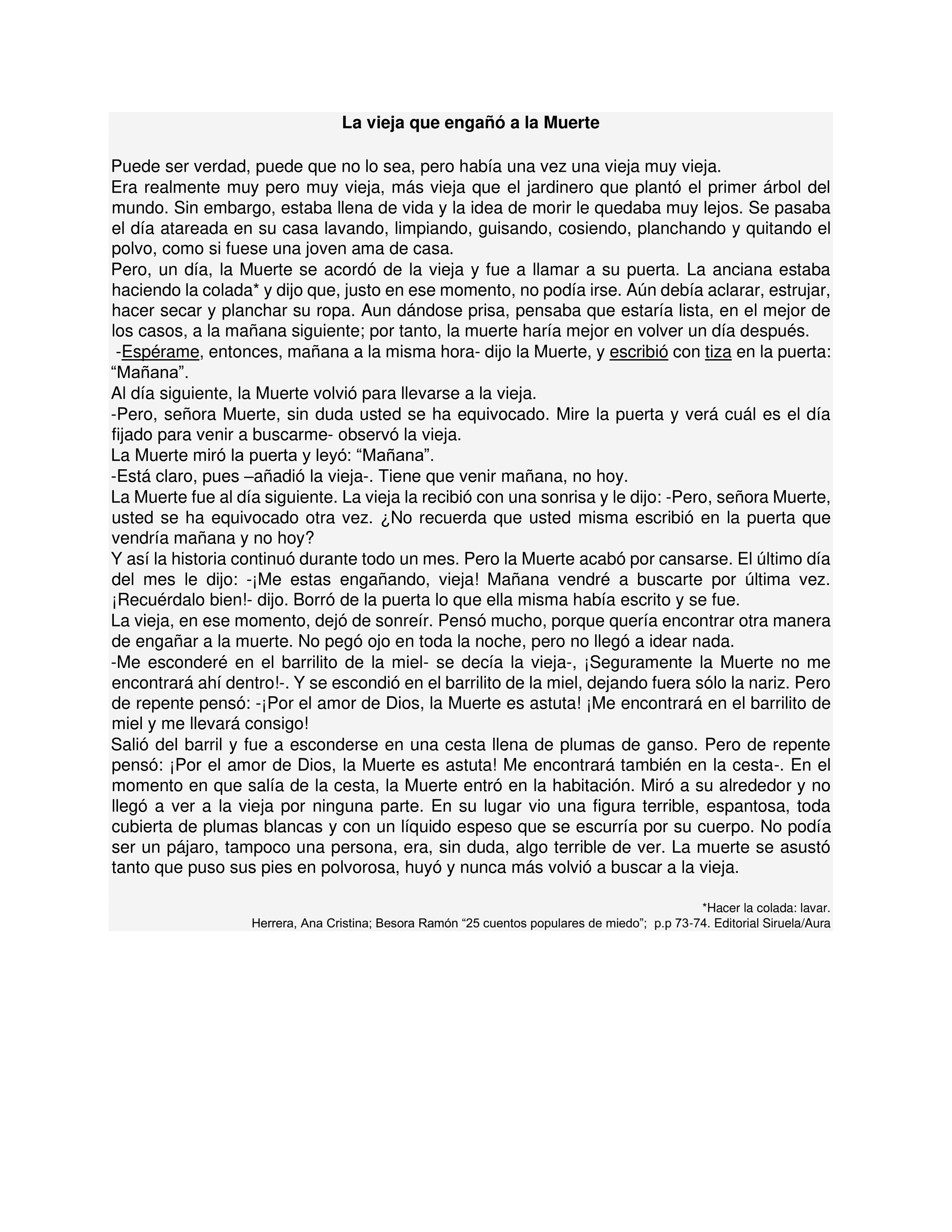 El que la Muerte se alejara por el susto que se llevó al ver a la vieja disfrazada de un ser terrible, fue resultado de: