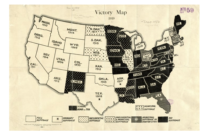 According to the map, most states allowed women to vote in 1919.