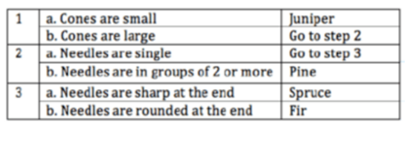 15. A dichotomous key for trees is provided. Hikers found atree that has large brown cones and single sharp needles.What species of tree have the hikers found? 📷