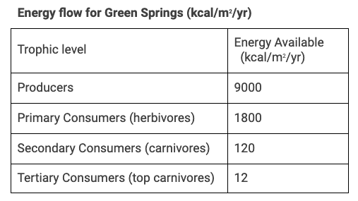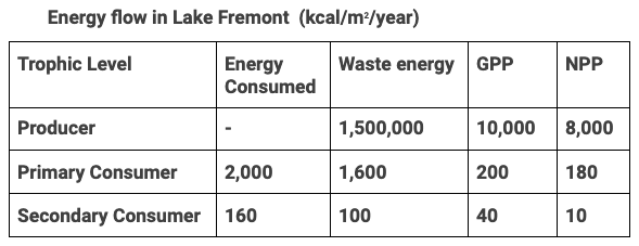Based on the table above, calculate the efficiency of energy transfer (in percent) from producers to primary consumers.