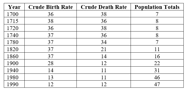 Better water and medicine so infant mortality and death rates decrease but people are not ready to give up free labor so they continue to have children and birth rates are high | arrow_right_alt | Stage 1 |