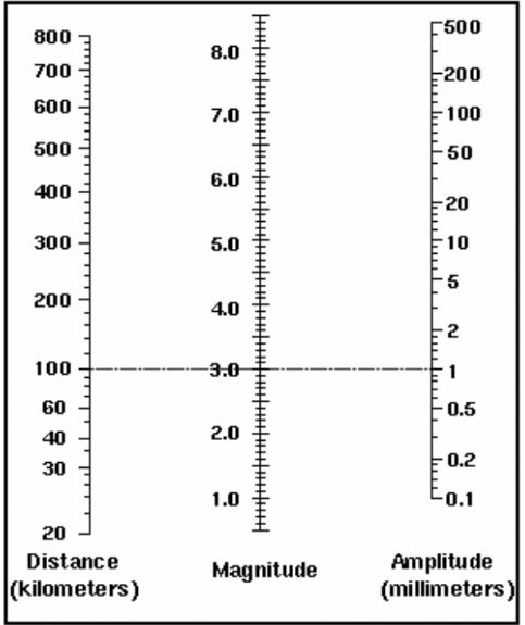 How big was that quake? The Richter scale is used to determine how powerful a quake is. Similar to stars, the intensity to the observer is dependent on distance from the quake. This chart is used to determine the quake’s strength. Place a point on the left side according to the quake’s distance. Place another point on the right side for the observed amplitude of shaking (use a seismogram reading). Last draw a line connecting the two points and the middle number is the Richter magnitude of the quake. For example a quake with an amplitude of 1mm that is 100 km away would have a magnitude of 3.0. Remember that an increase of 1.0 on the Richter scale is equal to 10 times the magnitude (and 32 times the amount of energy). So a quake that is a 6.0 on the Richter scale is 1000 times more powerful than our practice problem.