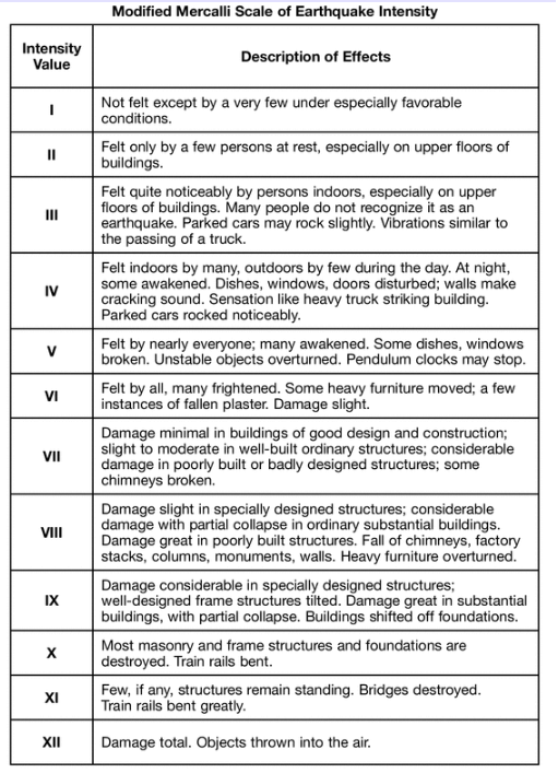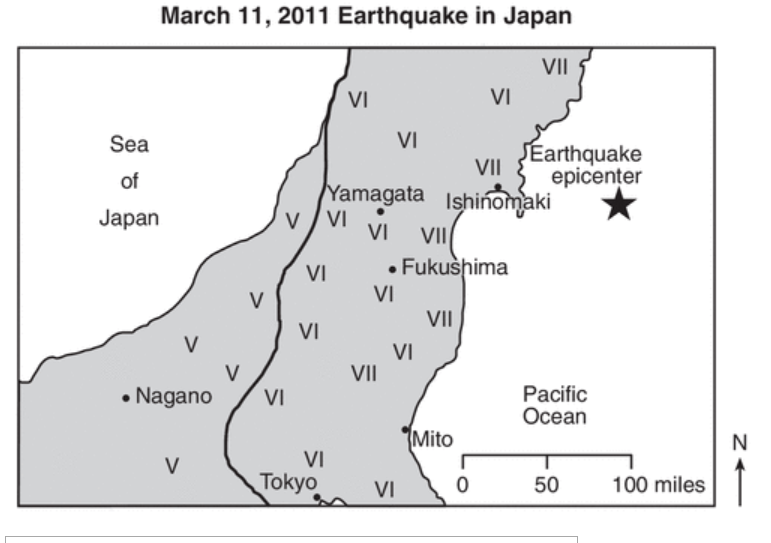 Read the Modified Mercalli Scale above. On the map in your answer booklet, a line has been drawn to separate regions with Mercalli values of V from regions with Mercalli values of VI. Using the touchscreen or your mouse Draw another line to separate regions with Mercalli values of VI from regions with Mercalli values of VII