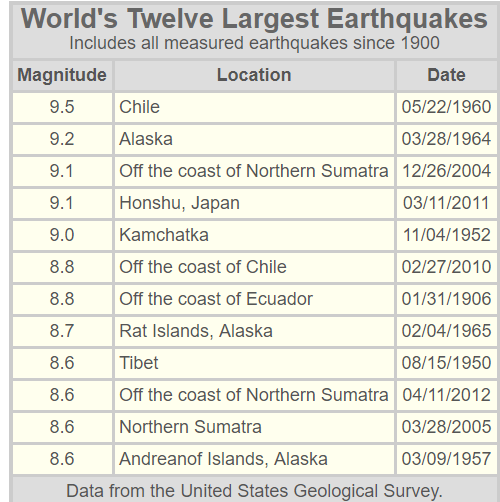Below is a list of the strongest earthquakes ever recorded