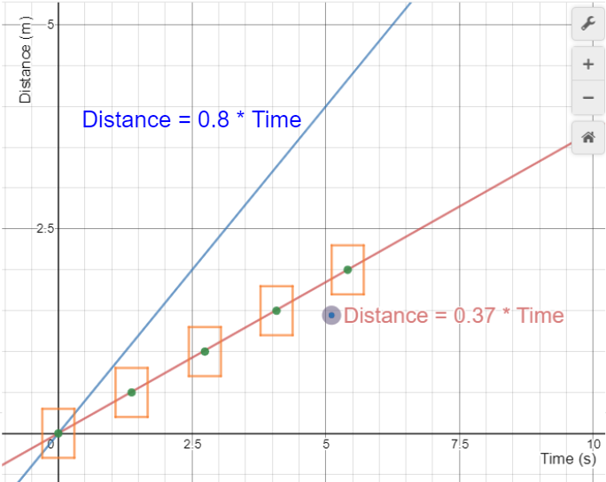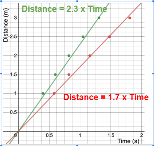 The graph above shows data for two bowling balls that were rolling along a flat floor. Which line has the larger A-value
