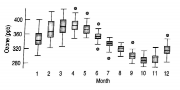 The EPA (Environmental Protection Agency) provides Ozone measurements throughout the year.Use the side by side boxplots below to compare the months of the year.