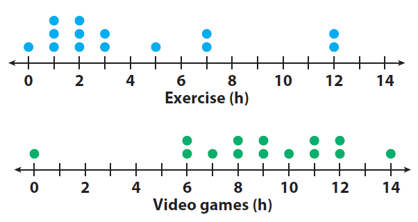 The dotplots below compare data gathered on teenagers comparing the hours they spent on exercise and video games.