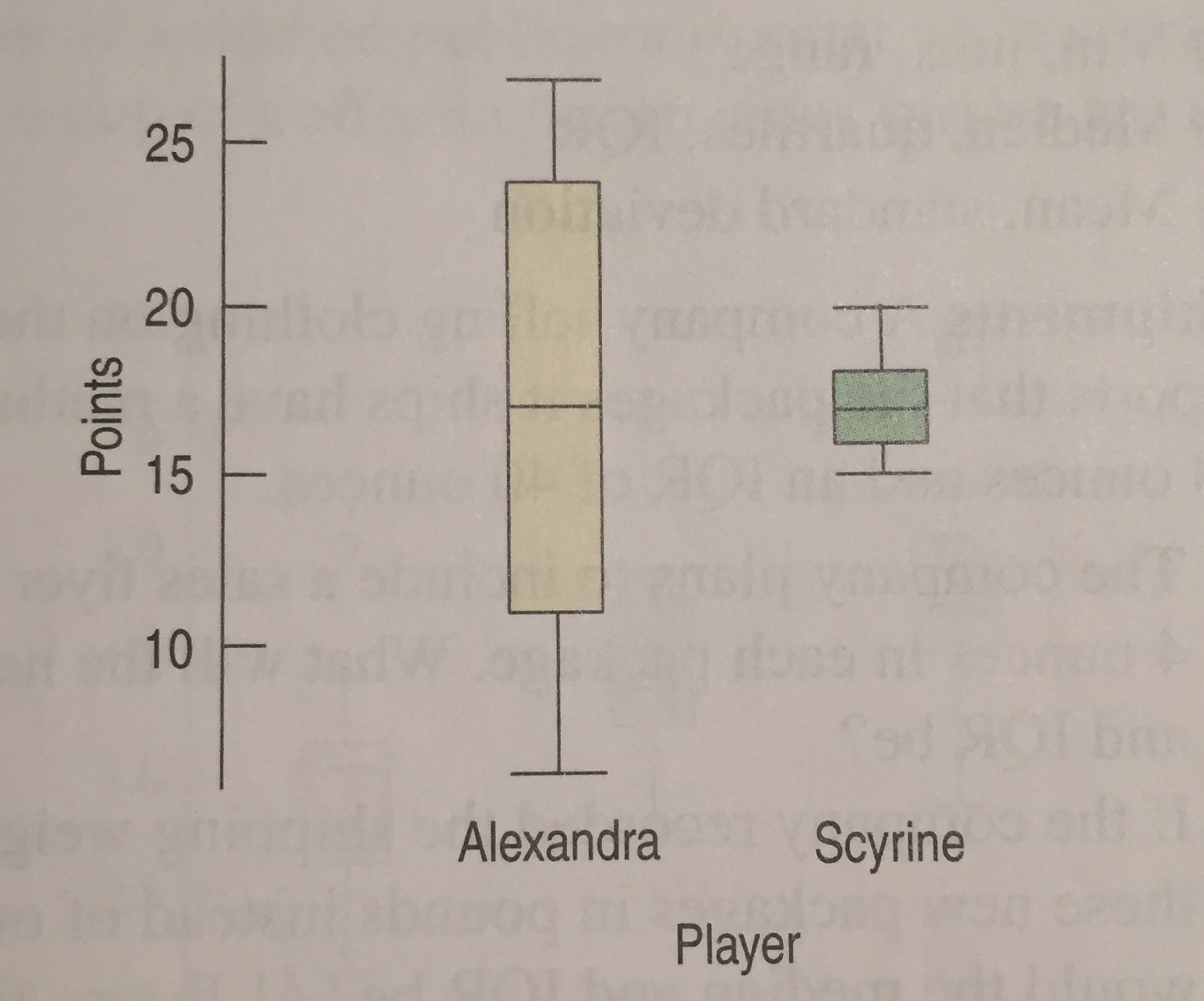 Here are boxplots of the points scored during the first ten games of the basketball season for both Scyrine and Alexandra: