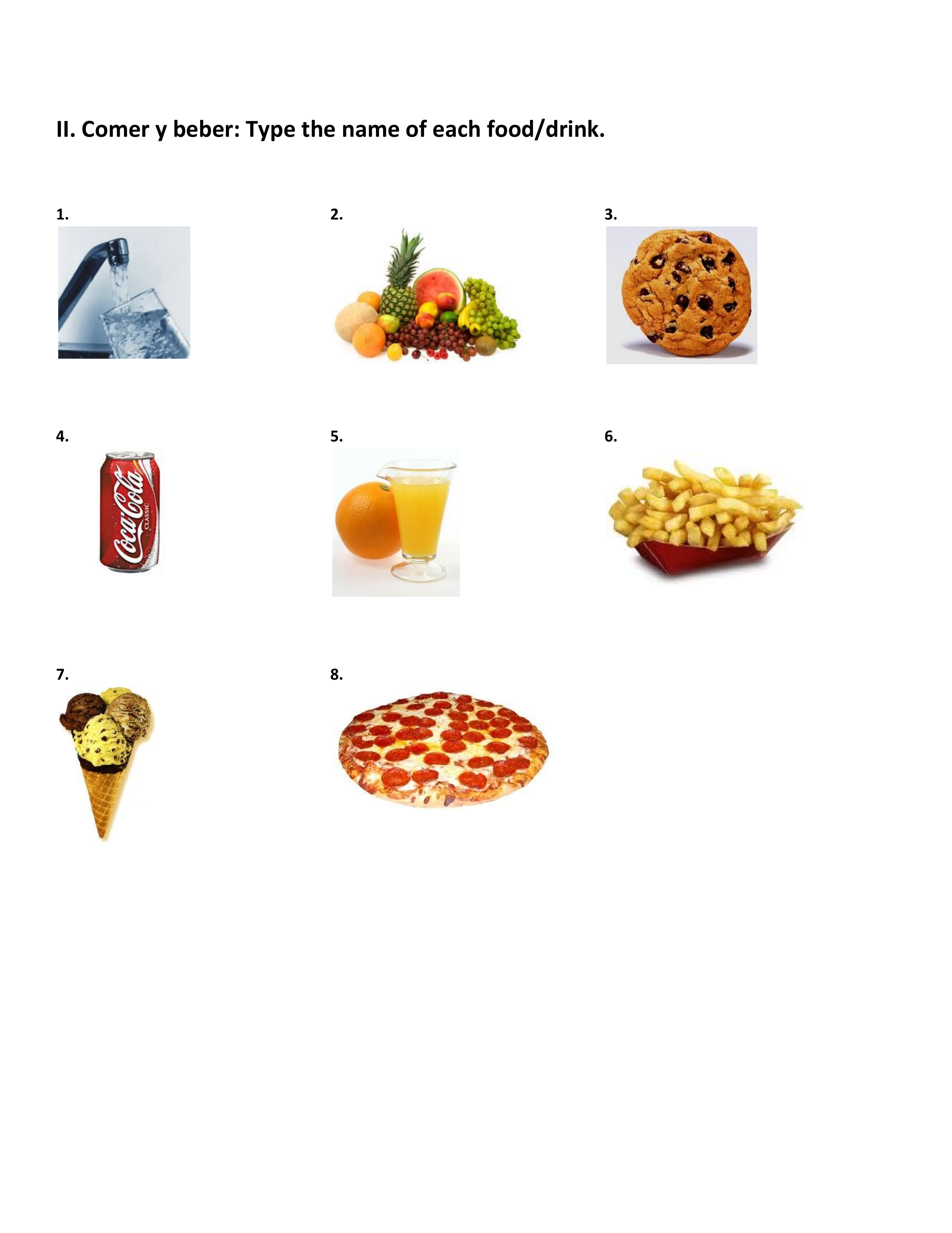 Type the name of each activity or food/drink in Spanish. Type with no extra spaces and it will be graded accurately. Spelling counts! It's OK if you don't add accents, it will be marked correct if your answer is otherwise spelled right. On the second page make sure you include the article (el, la, los or las) that goes with the noun, just like they are listed on your vocab list. Make sure you answer all 23 questions, and remember you can keep trying to get a perfect score in the time allowed before you submit this on Classroom.