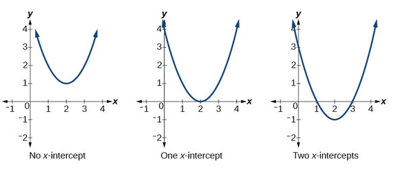 The x-intercepts are the points at which the parabola crosses the x-axis. If they exist, the x-intercepts represent the zeros, or roots, of the quadratic function, the values of x at which y=0. There may be zero, one, or two x-intercepts. The number of x-intercepts varies depending upon the location of the graph (see the diagram below).