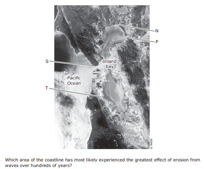 Which are of the coastline has most likely experienced the greatest effect of erosion from waves over hundreds of years?