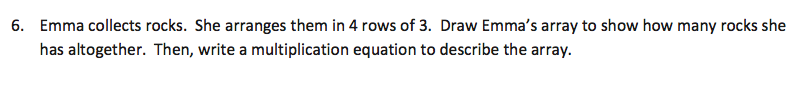 Emma collects rocks. She arranges them in 4 rows of 3. Draw Emma's array to show how many rocks she has altogether. Then, write a multiplication equation to describe the array.